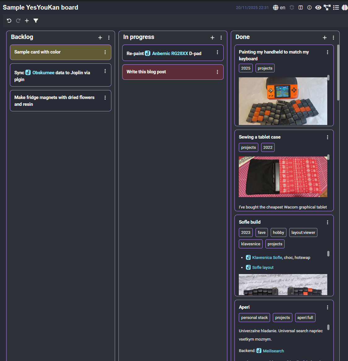 YesYouKan is a kanban plugin for Joplin, developed by Laurent - the maintainer of Joplin itself. When it was first published a year ago I appreciated the choice of the name, but didn't expect to use it. After all, I've tried a bunch of kanban tools but they never stuck.